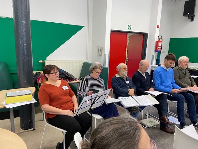 Het was stug doorwerken om al deze liedjes onder handen te nemen, maar toch was er ook nog tijd om wat te converseren in de pauze. We waren vandaag met ongeveer 30. Uniek in onze geschiedenis : we waren met 6 tenoren/bassen. Tel daarbij nog al die enthousiaste sopranen en alten, en je zal me geloven dat het (weer) goed was.