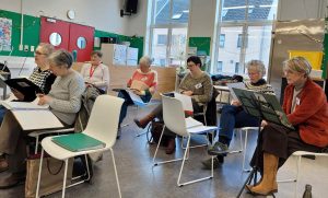 We zongen : Amar es entregarse, Bella ciao, twee meisjes, Lolo mi boto, Epo i tai tai, en Hönsafötter. Ons Zweedse afsluitlied bij het oefenen weliswaar zonder het gekakel, maar op het eind van de repetitie met alles erop en eraan :-). Ik stuur de mp3’s die bij deze liedjes hoen nog naar jullie door !