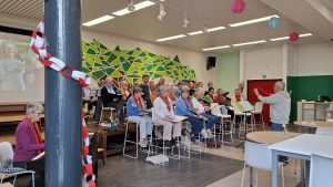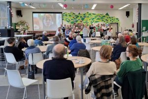 Na de pauze gingen wij aan de tafels onze gasten zitten, om samen nog een aatal volksliederen te zingen. En ook dat was gezellig …. Veel te snel was het tijd om af te ronden, en dat deden we in stijl, met Hönsafötter. We namen afscheid van onze gasten, en door de vele helpende handen was de afwas al snel gedaan, alles opgeruimd, en ….. de centen geteld : er zaten 321,01 eurokes in het mandje. We hadden met het kerngroepje afgesproken dat wij als koor de onkosten zouden dragen, dus dit hele bedrag wordt overgeschreven naar Broederlijk Delen.