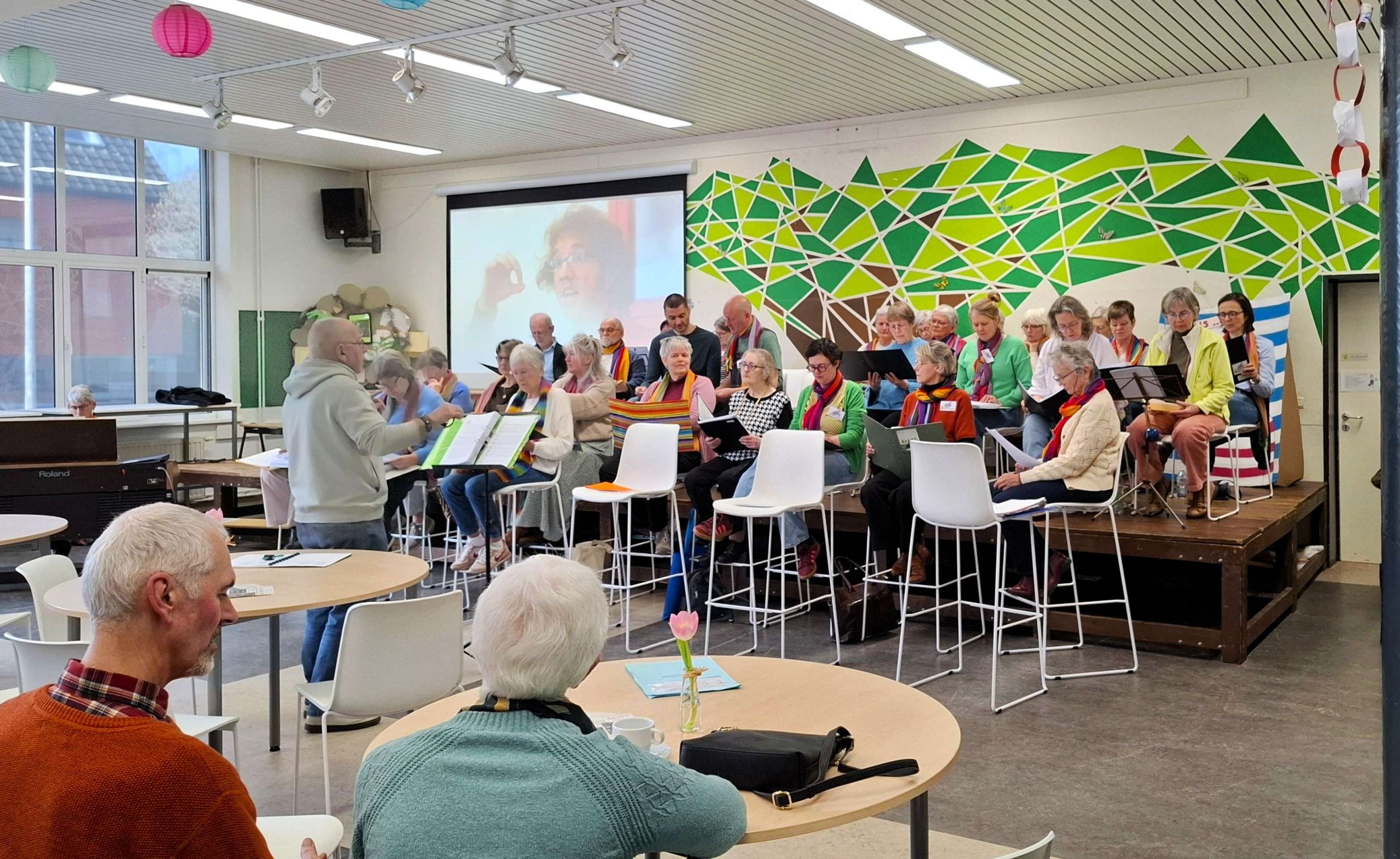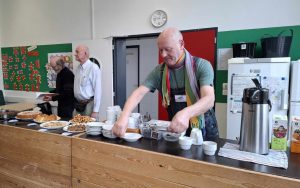 Zaterdag pakten we een oude traditie weer op, we organiseerden een koffiestop. Altijd best even spannend vind ik, want het is toch fijn als er dan wat mensen op af kwamen. We spraken wat vroeger af, om de zaal te schikken, en op deze eerste lentedag werden de tafels vrolijk versierd met een bloemeke. Alle lekkers werd mooi gepresenteerd op den toog. De koffie stond te pruttelen en het water voor de thee was klaar. Voor onszelf hadden we een plek gevonden voor en op het podium. We waren er helemaal klaar voor.