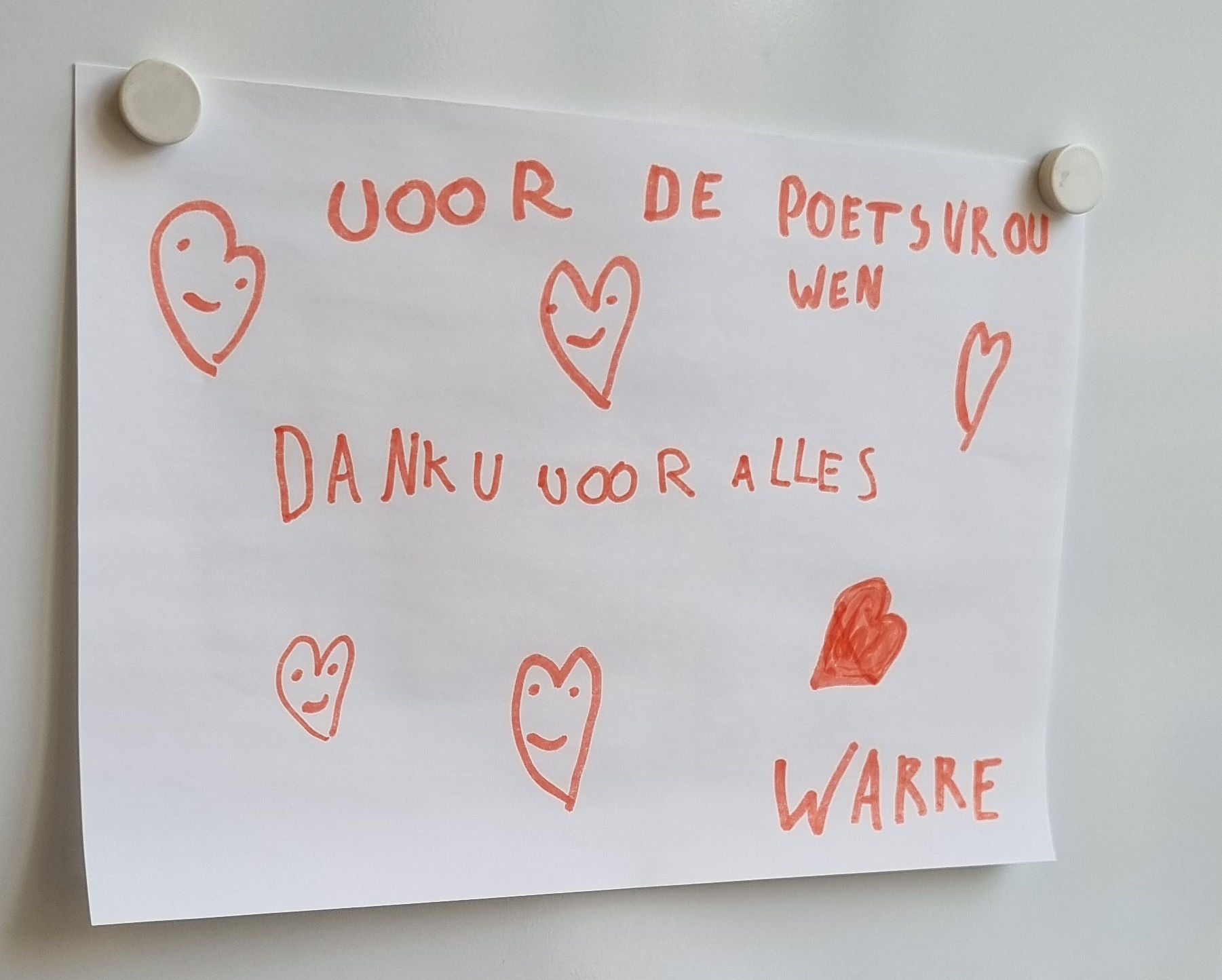 Gespot in de zaal : dit leuke bericht dat Warre voor de poetsvrouw schreef, hoe lief, en nog een laatste foto.